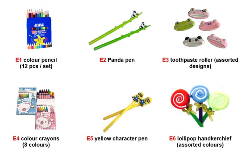 | Select one from Group E | Colour pencil, Panda pen, Toothpaste roller, colour crayon, Yellow character pen, Lollipop handkerchief |